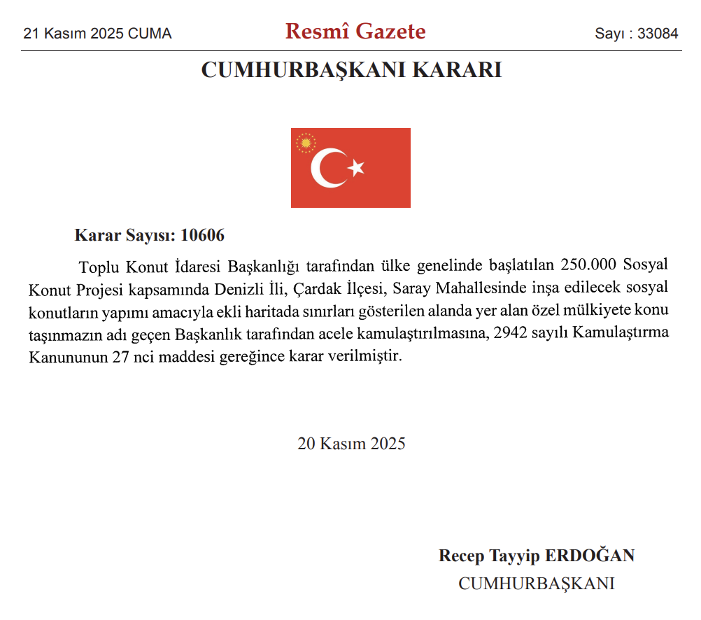 21 Kasım 2025 tarihli ve 33084 sayılı Resmî Gazete’de yayımlanan 10606 sayılı Cumhurbaşkanı Kararı ile; Denizli İli, Çardak İlçesi, Saray Mahallesi sınırları içinde yer alan bazı taşınmazların, 250.000 Sosyal Konut Projesi kapsamında Toplu Konut İdaresi Başkanlığı (TOKİ) tarafından acele kamulaştırılmasına karar verildi.