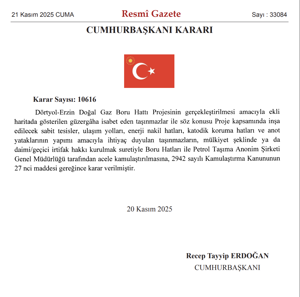20 Kasım 2025 tarihli ve 33084 sayılı Resmî Gazete’de, Cumhurbaşkanı Kararı ile 10616 sayılı acele kamulaştırma kararı yayımlandı.