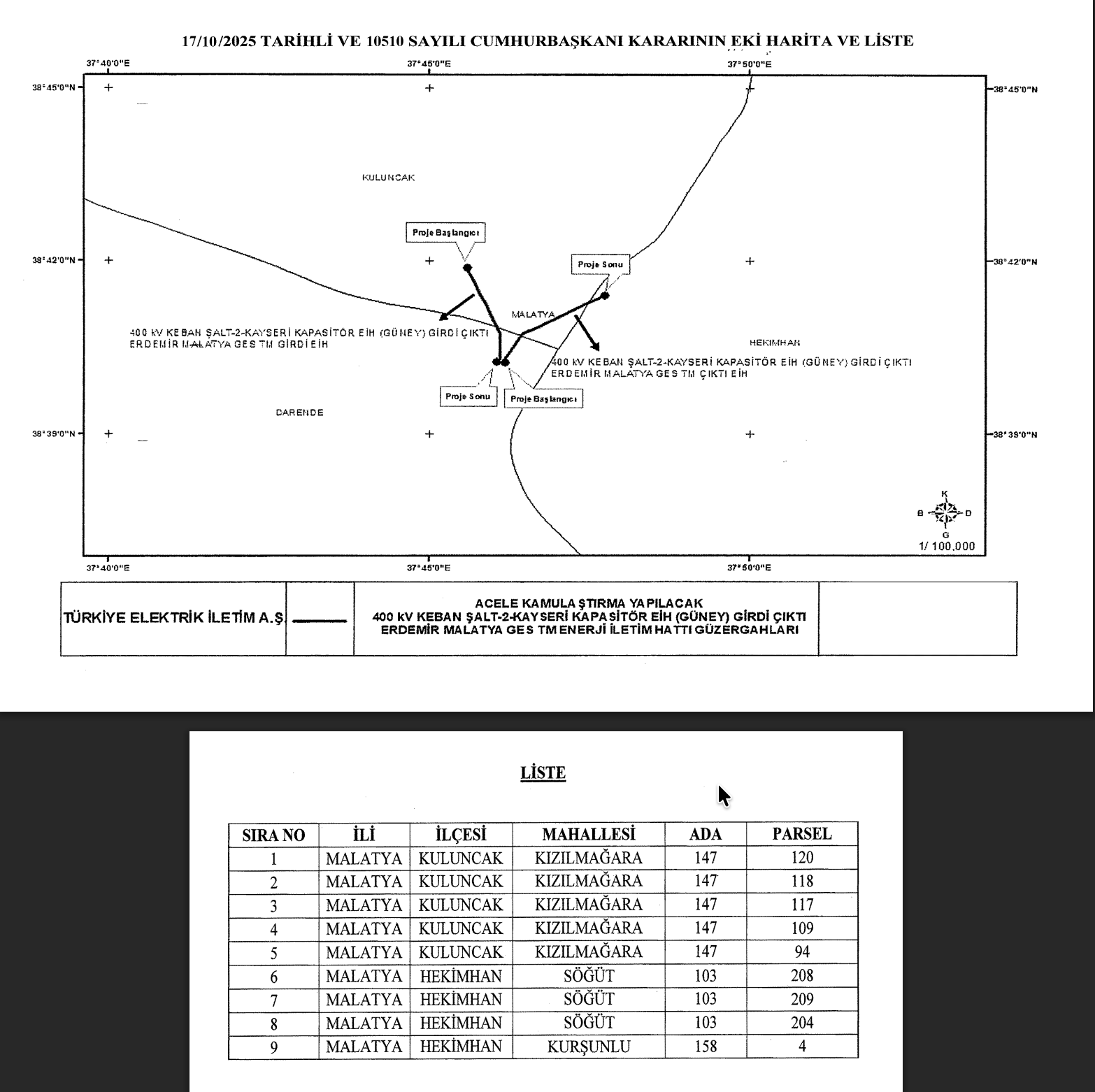 Cumhurbaşkanlığı kararıyla, Malatya ve çevresinde inşa edilecek “400 kV Keban Şalt-2–Kayseri Kapasitör EİH (Güney) Girdi-Çıktı Erdemir Malatya GES TM Enerji İletim Hattı Projesi” kapsamında, belirlenen güzergâhlarda yer alan taşınmazların acele kamulaştırılmasına karar verildi.