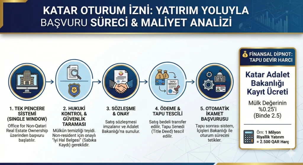 Yatırım yoluyla ikamet süreci, “Office for Non-Qatari Real Estate Ownership” üzerinden tek pencere (Single Window) sistemiyle yürütülür.