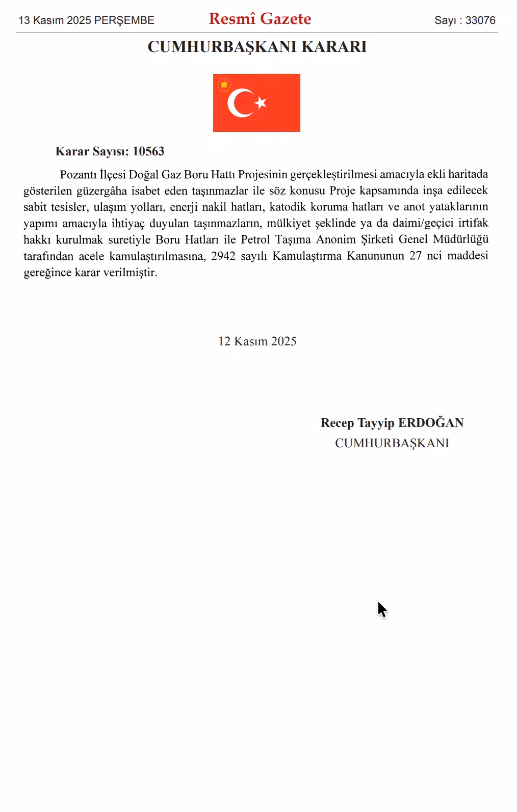13 Kasım 2025 tarihli ve 33076 sayılı Resmî Gazete’de yayımlanan 10563 sayılı Cumhurbaşkanı Kararı ile Adana’nın Pozantı ilçesi başta olmak üzere, doğal gaz iletim hattı güzergâhında kalan çok sayıda taşınmazın acele kamulaştırılmasına karar verildi.