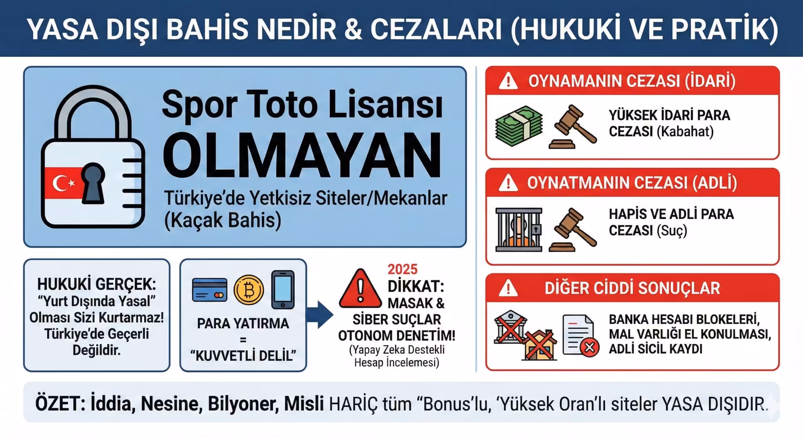 Özetle: İddia, Nesine, Bilyoner, Misli gibi devlet denetimindeki platformlar haricinde; internette gördüğünüz, yüksek oran vaat eden, “Bonus” dağıtan sitelerin tamamı yasa dışı bahis kapsamındadır.